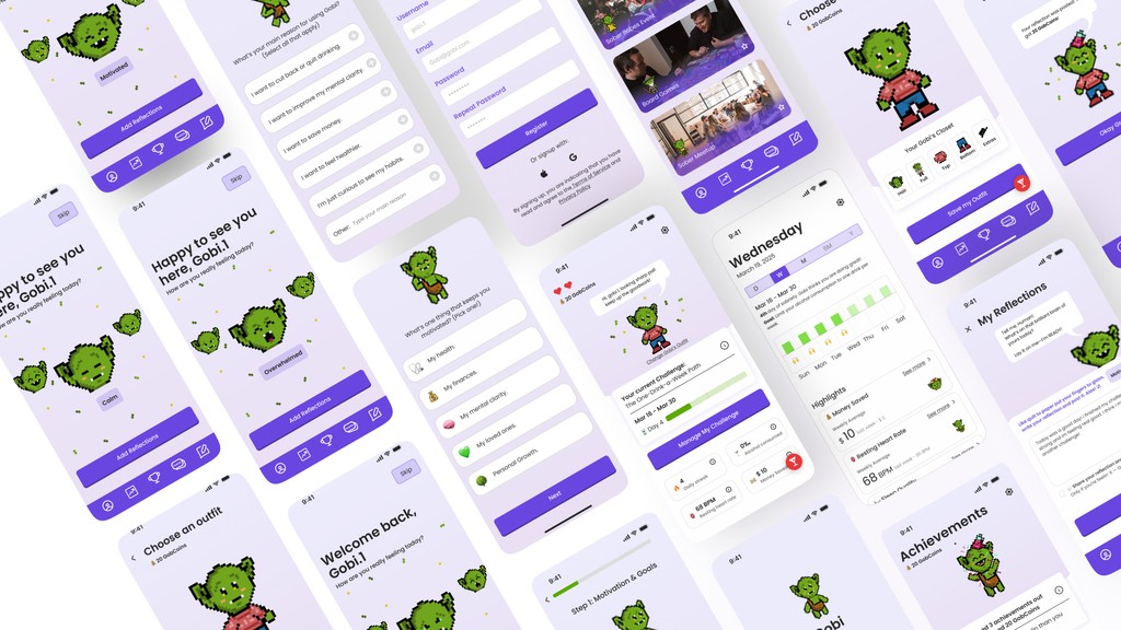 Gobi is a gamified sobriety app that helps people track their progress with empathy and encouragement. Designed through a research-heavy design thinking process, it blends behavioral insight, storytelling, and playful UI to make wellness feel more human and motivating.