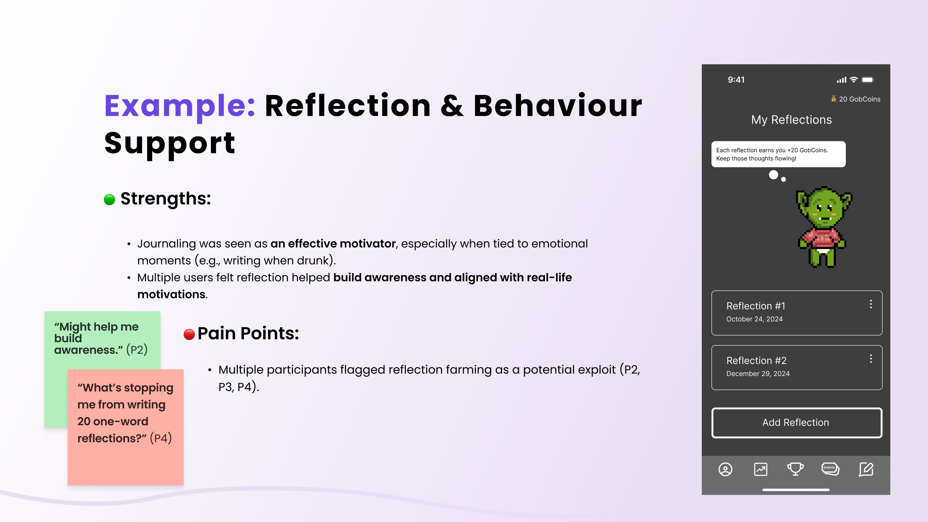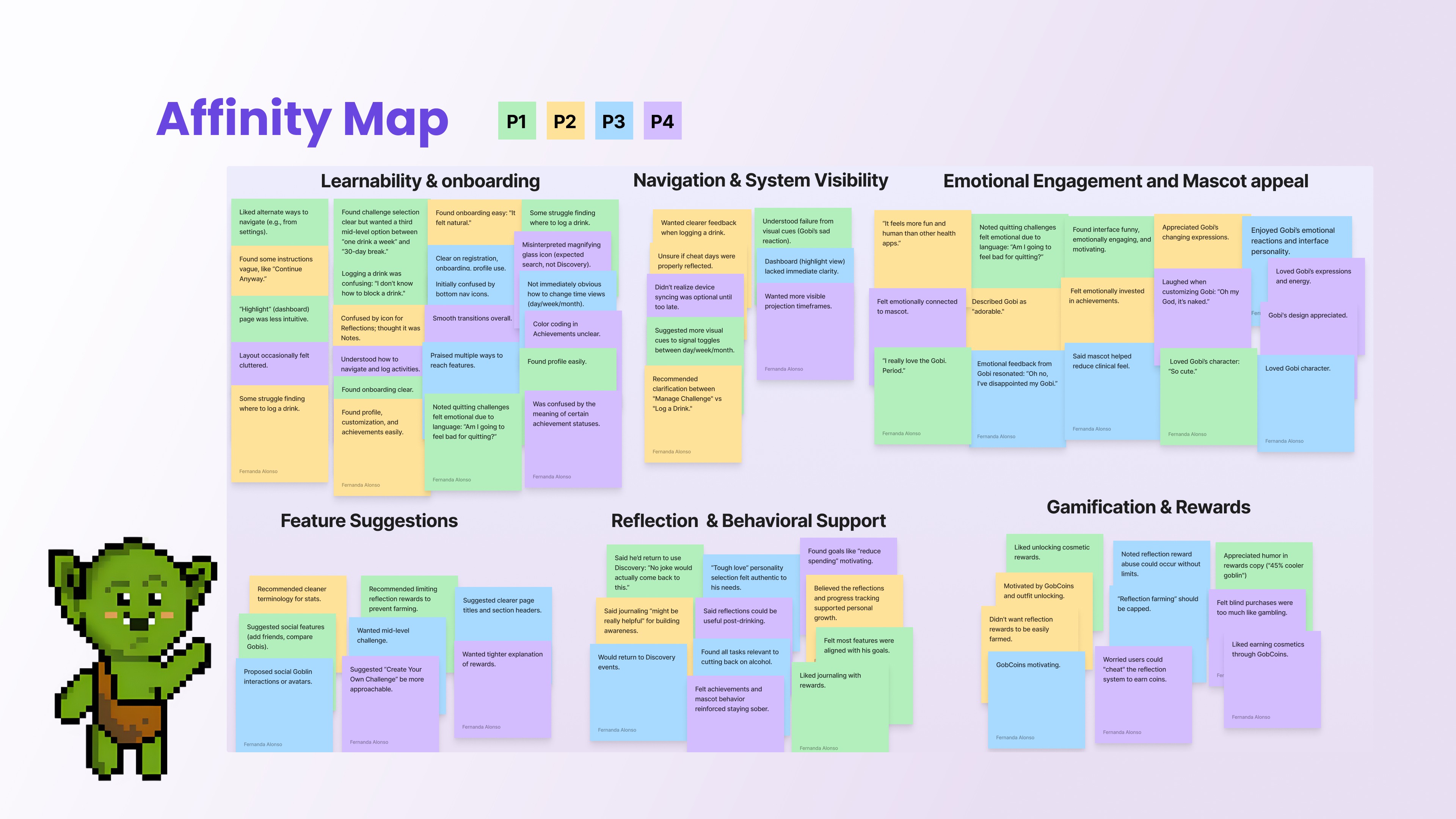 After usability testing, we organized participant feedback into an affinity map to identify key themes and opportunities. This process revealed that users valued motivation, clarity, and emotional tone over tracking alone. They wanted Gobi to feel positive and supportive, not corrective. These findings guided final adjustments to flow, copy, and animation timing.