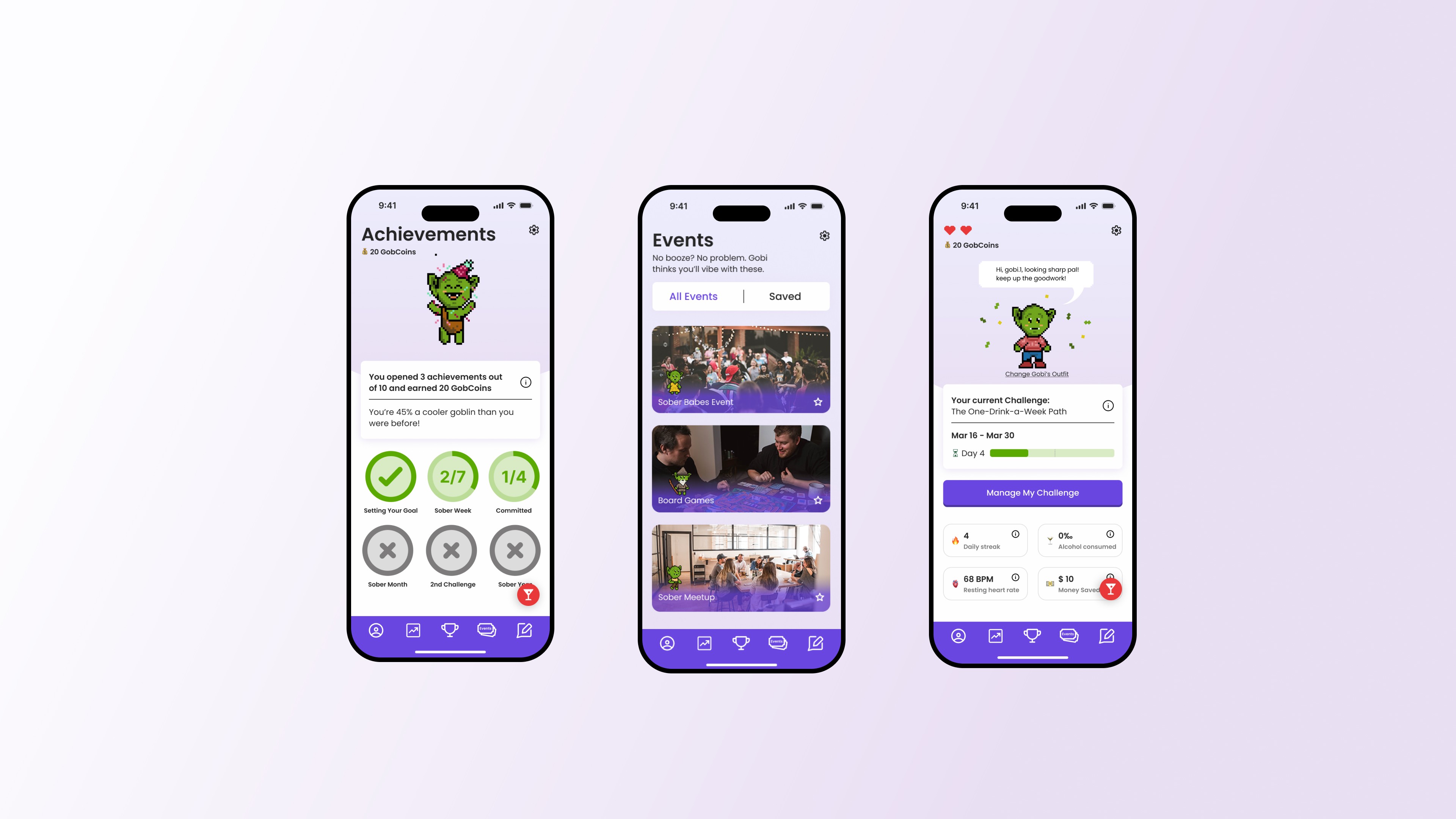 This flow celebrates user milestones and promotes real-world connection. Achievements reward consistency with GobCoins, while the Events page helps users discover sober social activities, blending motivation with community and fun.