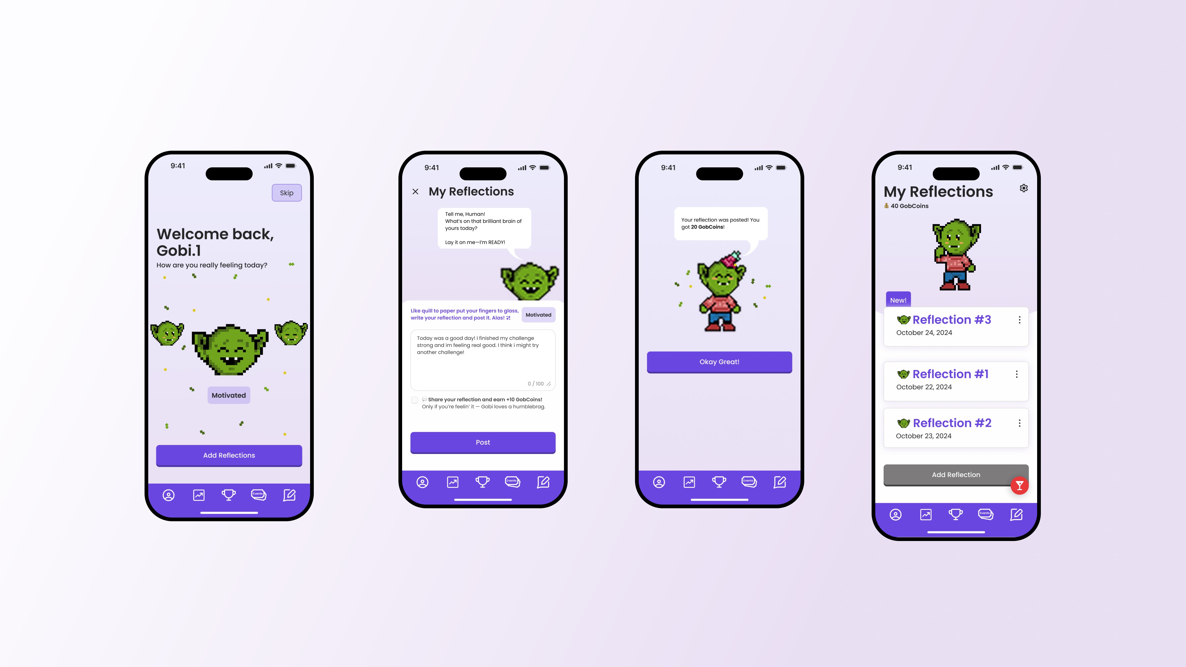 This flow lets users check in on their mood and write daily reflections. Each entry earns GobiCoins and reinforces mindful progress tracking within the app.