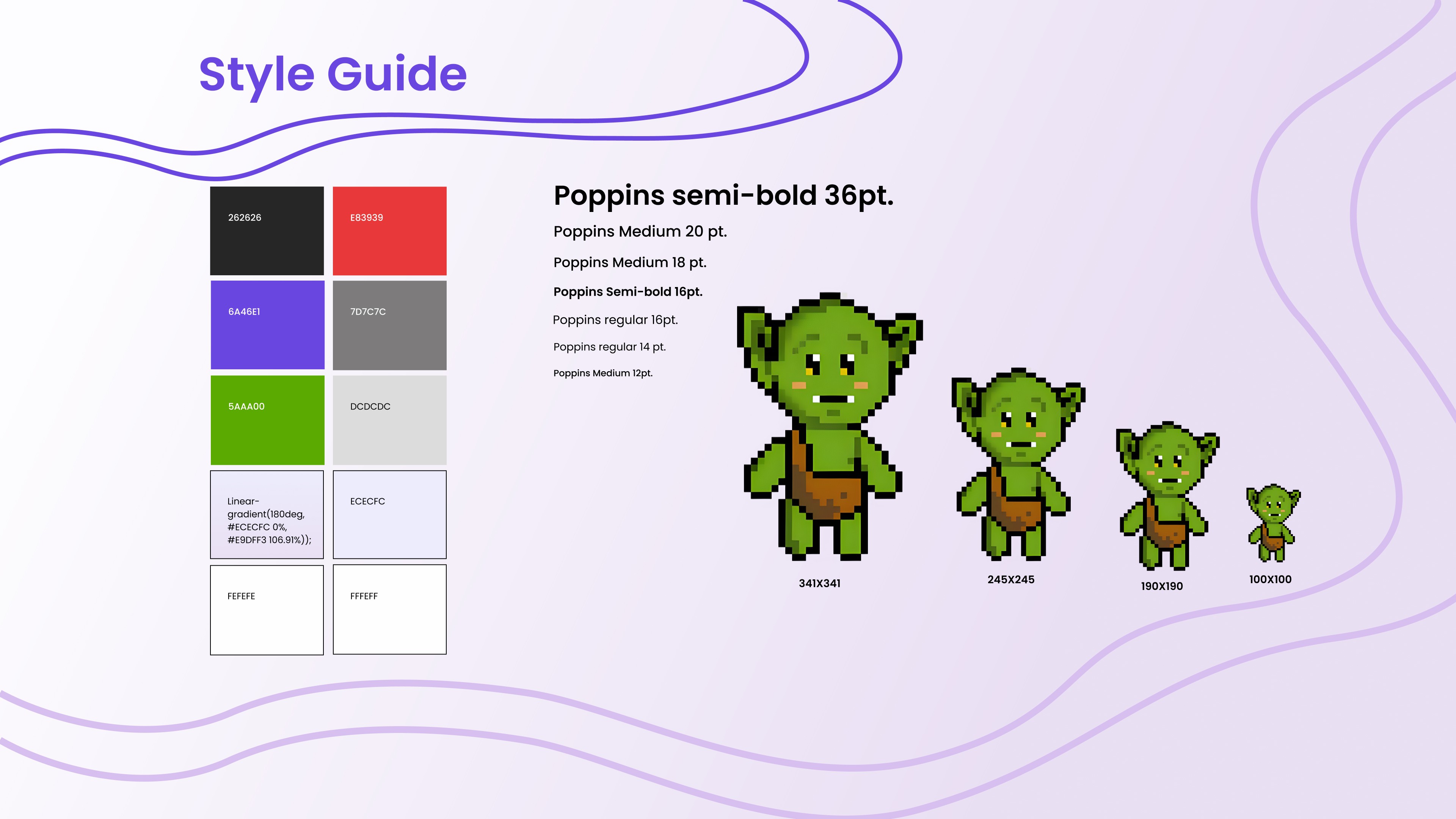 We wanted Gobi to feel playful and friendly while maintaining structure and focus. The palette mixes purples and greens to represent balance and progress, while pixel-art visuals bring in a nostalgic sense of fun. The typography was kept clean and approachable with Poppins for easy readability.