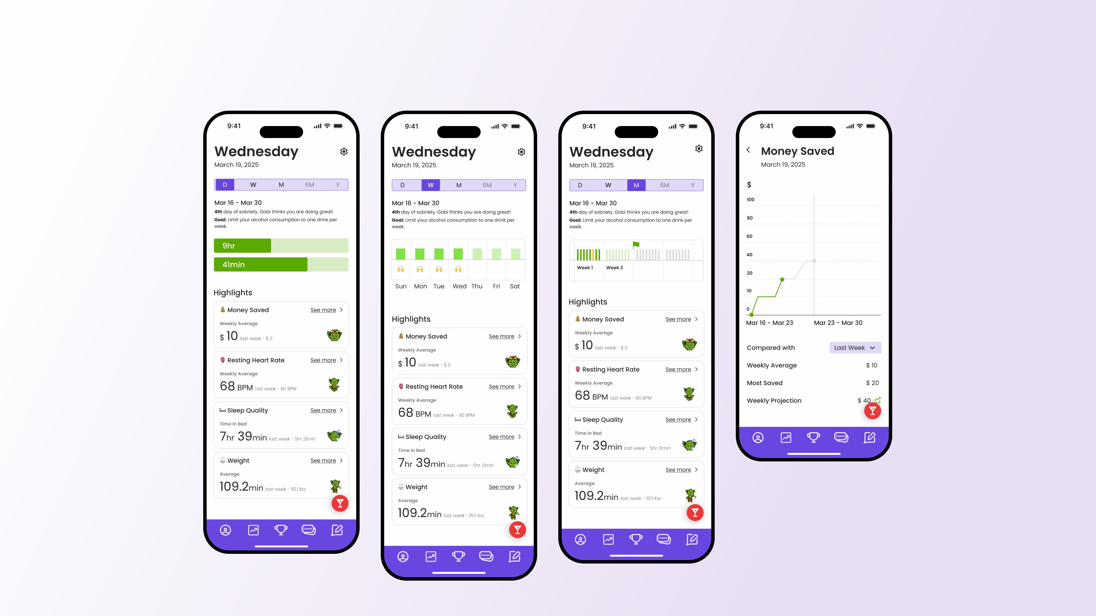 This flow visualizes user data like time saved, money saved, and health metrics. It turns progress into motivation through simple charts and friendly feedback from Gobi, helping users see tangible results from their habits.