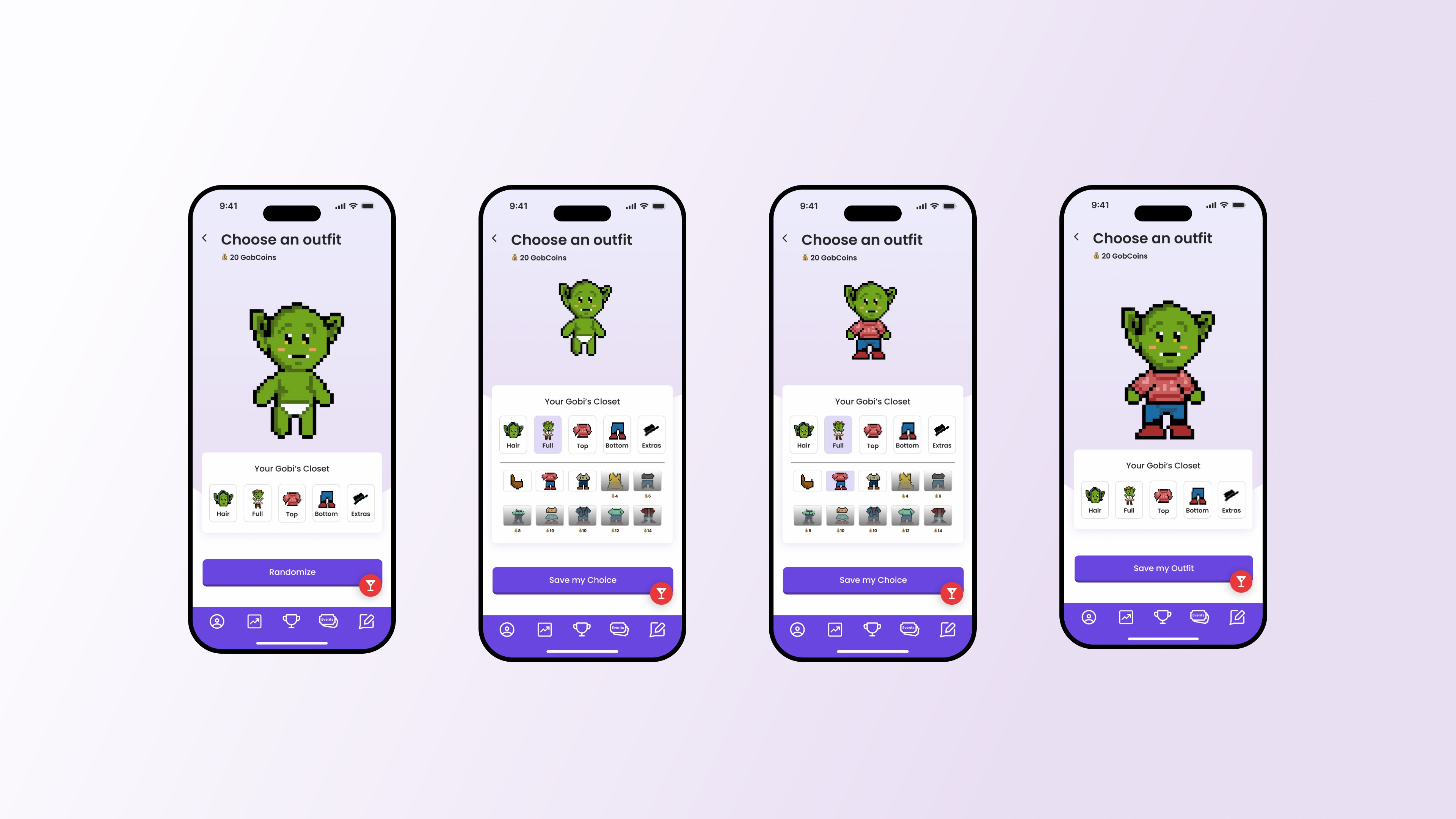 This flow lets users customize their goblin character using GobCoins earned through challenges. Personalizing Gobi’s outfit adds fun and self-expression, helping users connect emotionally with their progress and stay motivated.
